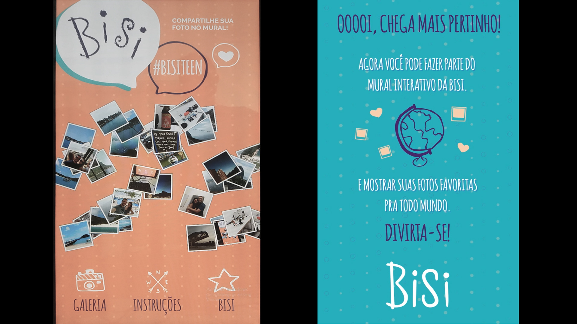Através de um mural interativo, o público teen que frequenta as lojas Bisi pode compartilhar seus momentos e idéias. A dinâmica ocorre através de integração com redes sociais, criando naturalmente uma divulgação espontânea da marca. A Bisi é uma marca da S2 holding, grupo da Redley e Cantão