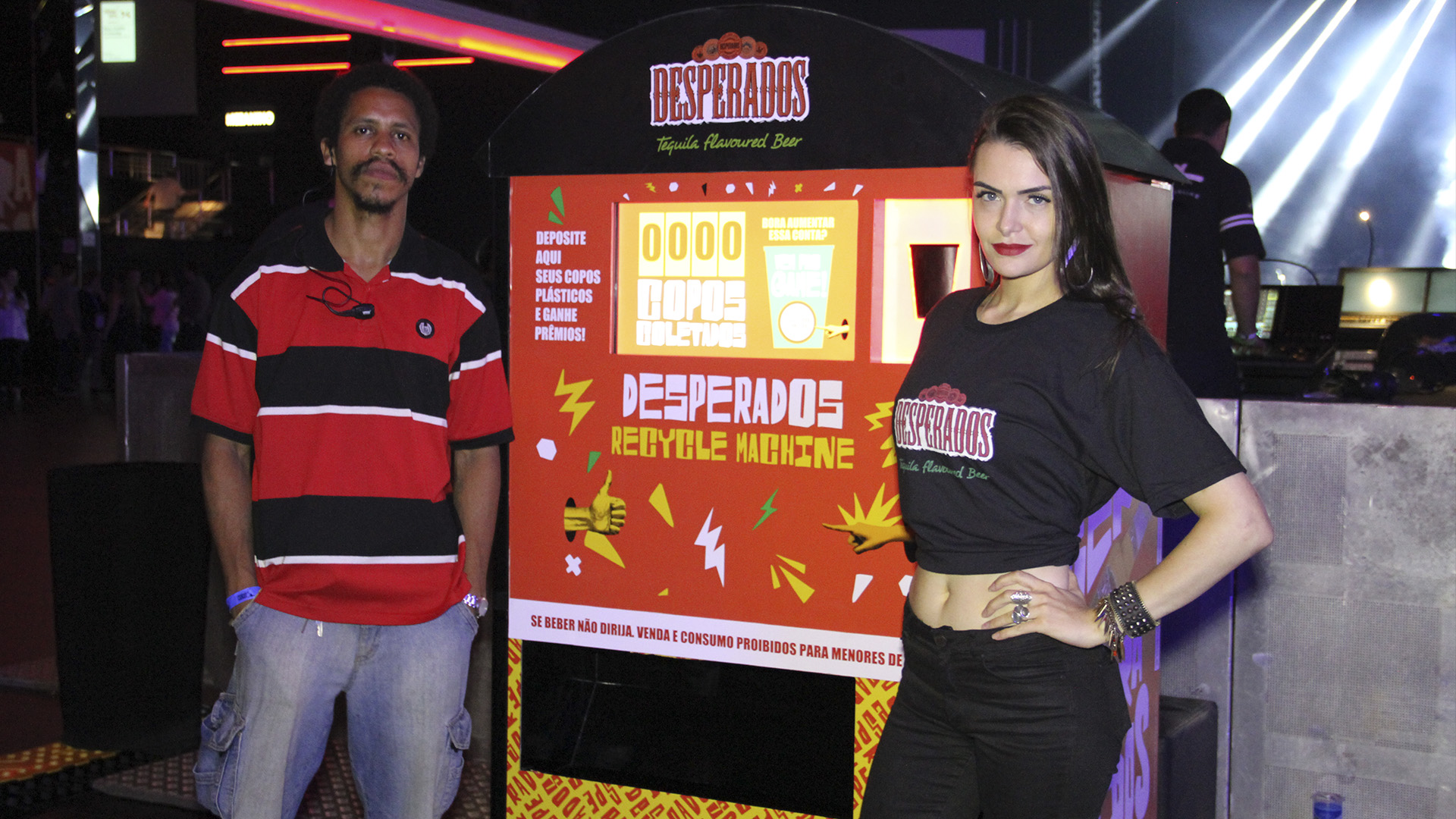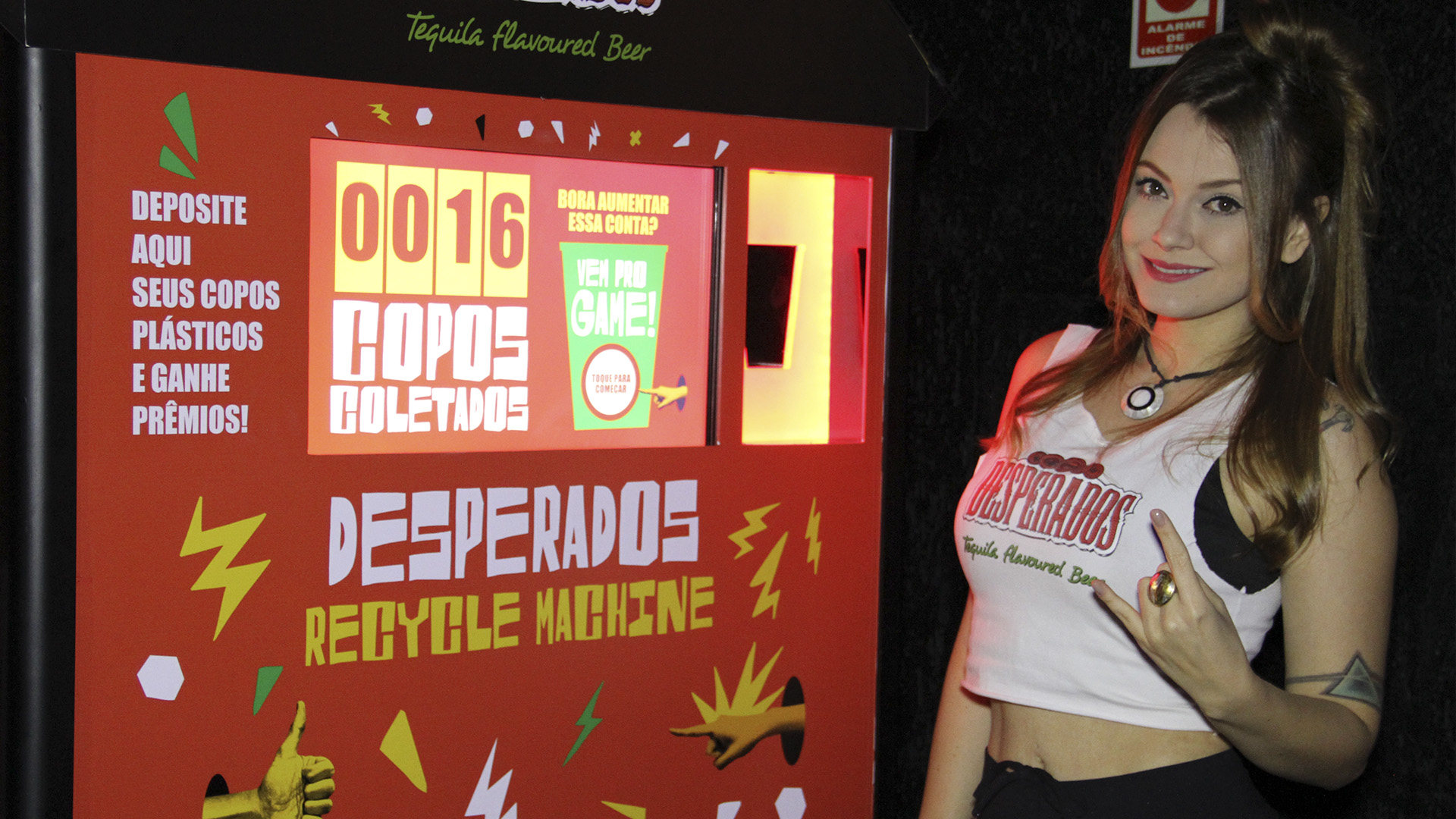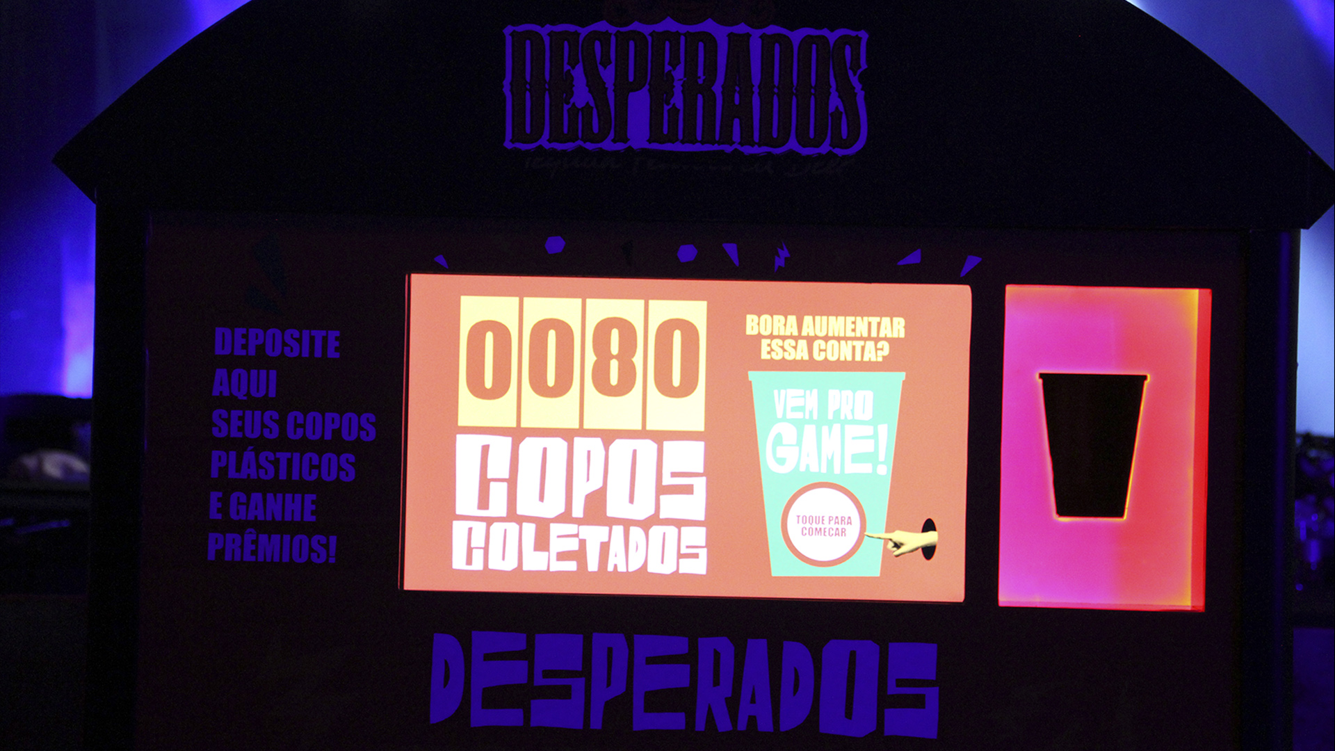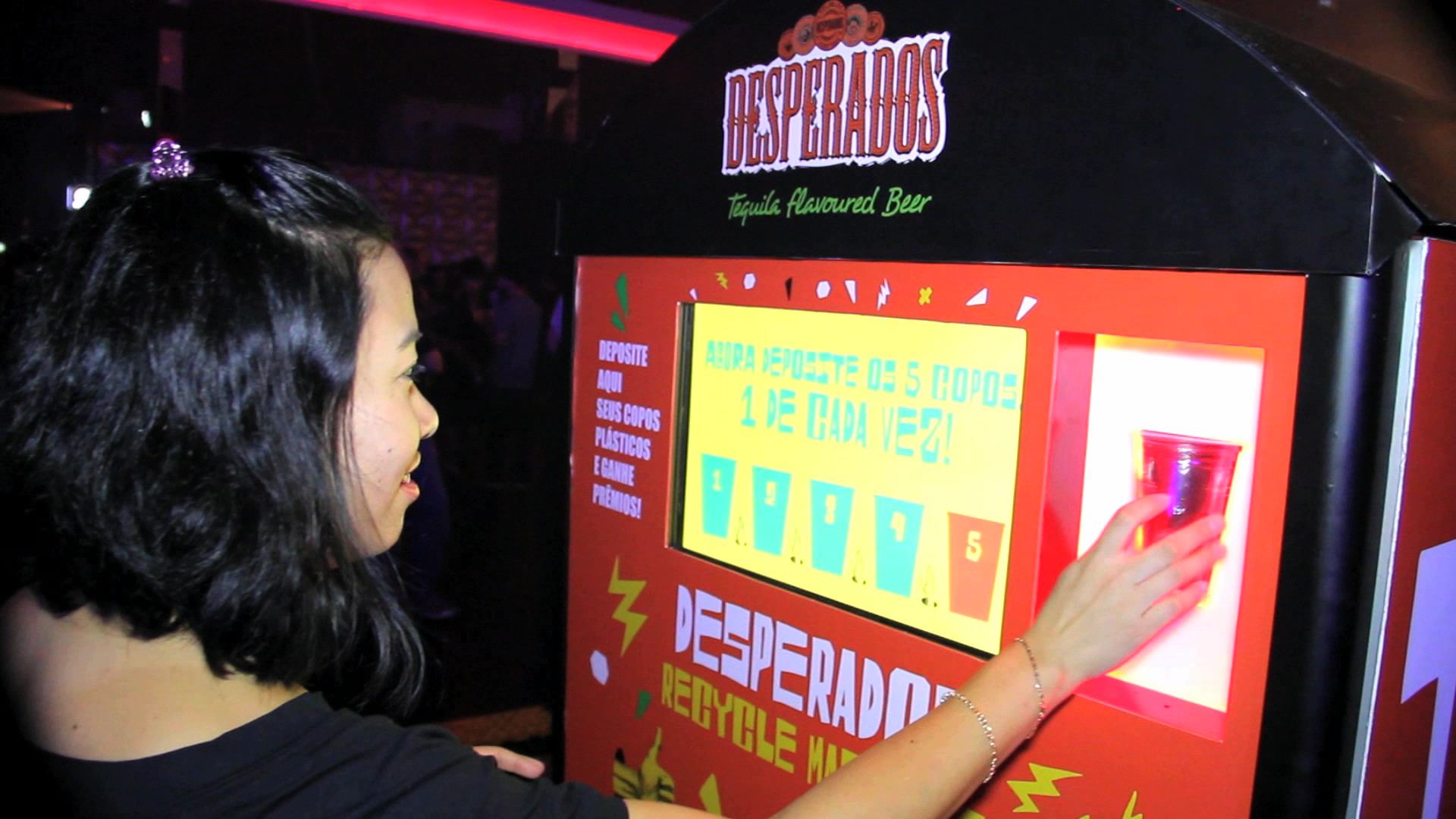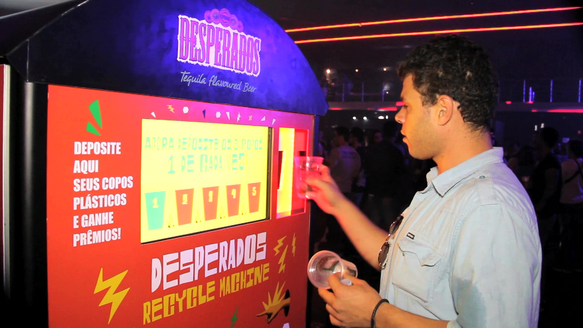 Máquina de coleta de copos descartáveis, sensorial e gamificada, desenvolvida de forma inteiramente personalizada pela Fictix para a Dream Factory/Desperados. A solução foi aplicada no evento SONAR, um dos mais importantes eventos de música eletrônica do país. A idéia foi estimular a coleta de lixo (copos plásticos) durante o evento, oferecendo créditos para um jogo no estilo “Jackpot” a cada 5 copos coletados. Ao ganhar um brinde no jogo, como ticket de água, bolsa personalizada de material reciclado, badges, etc.., o usuário pegava diretamente na máquina, que os liberava automaticamente. Um contador indicava quantos copos haviam sido recolhidos e seriam direcionados à reciclagem. Centenas de copos foram recolhidos, a marca Desperados foi ativada conforme planejado e a ação foi um sucesso.