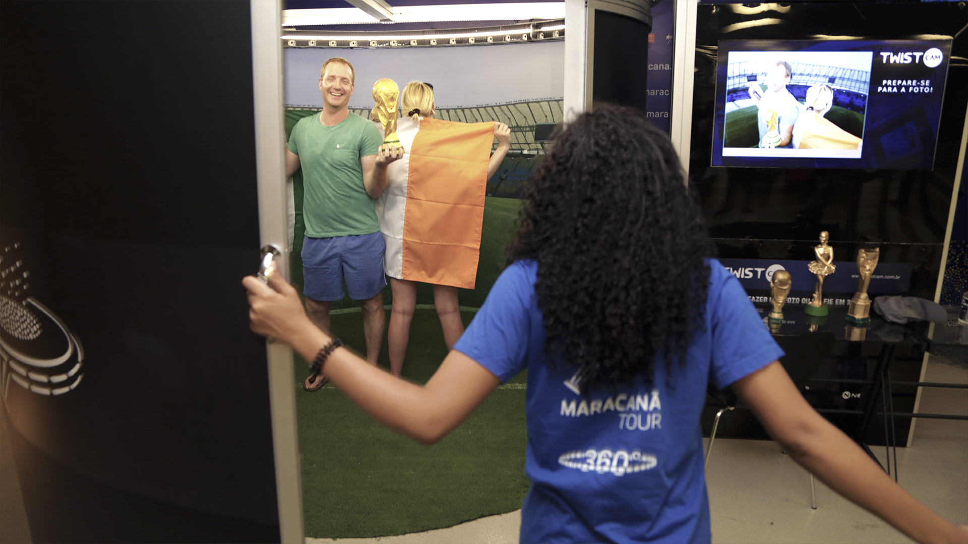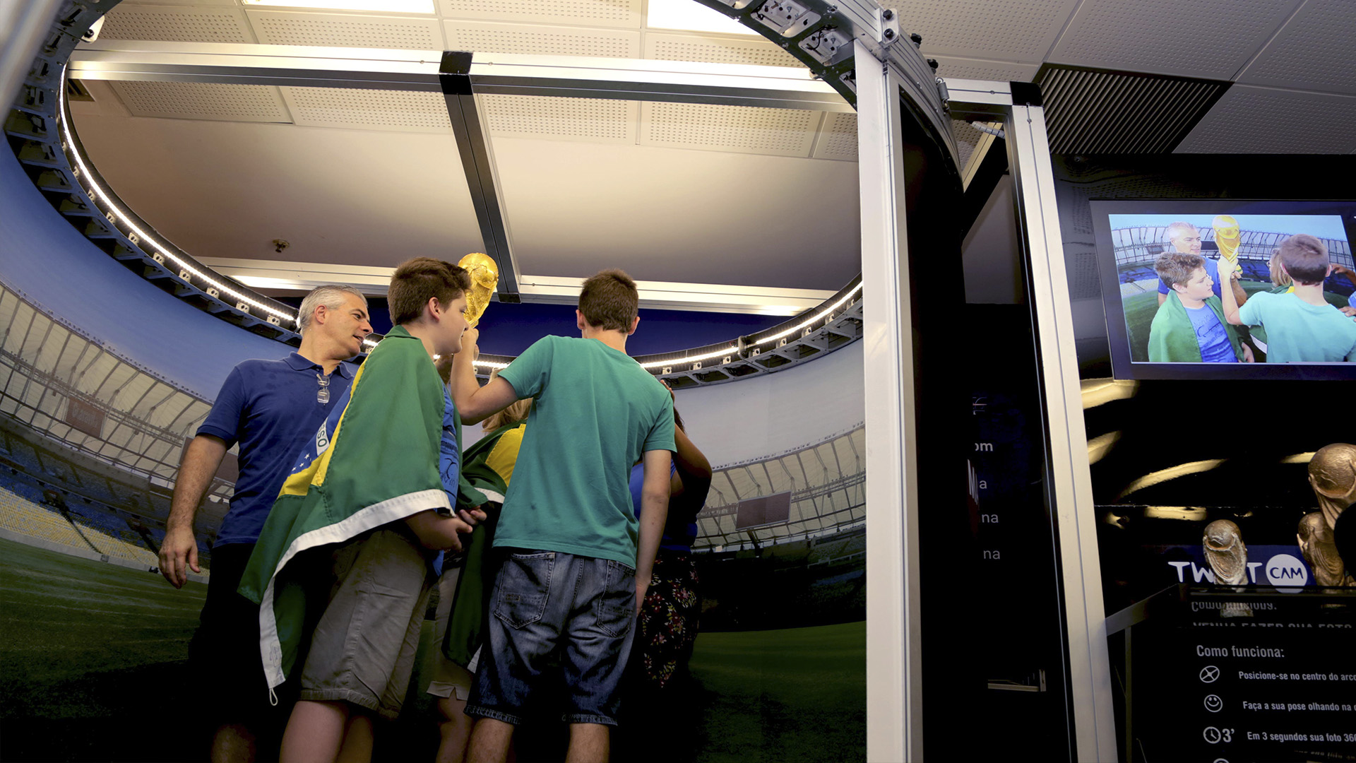 Instalação inovadora de mídia interativa que tira fotos em 360 graus dos visitantes do Maracanã. A foto digital em 360 graus é uma lembrança única do estádio mais importante do país.