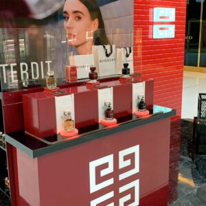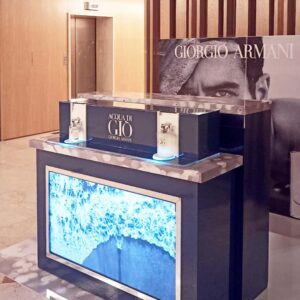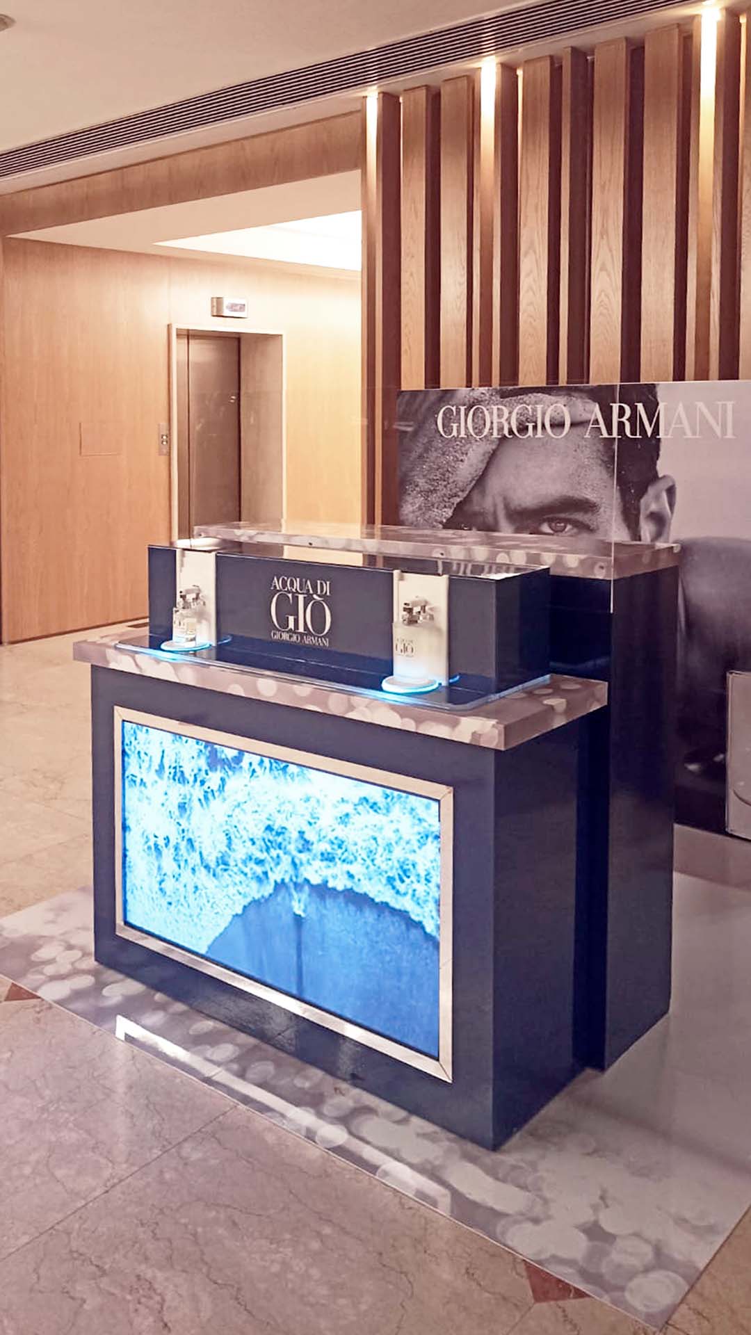 O frasco do perfume é iluminado a partir de sua base, criando um efeito óptico fascinante capaz de atrair a atenção do cliente. O sistema de leds é inteligente, possui padrões de animação, interage com a ação do cliente e permite a seleção remota da cor de acordo com a campanha.